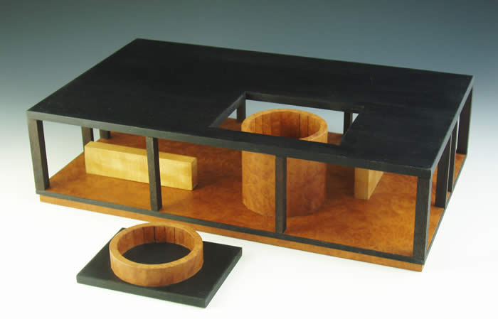 Dyed Costello, Madrone Burl, Anigre, English Maple. One compartment. This view shows the rectangular lid removed, uncovering the one compartment.