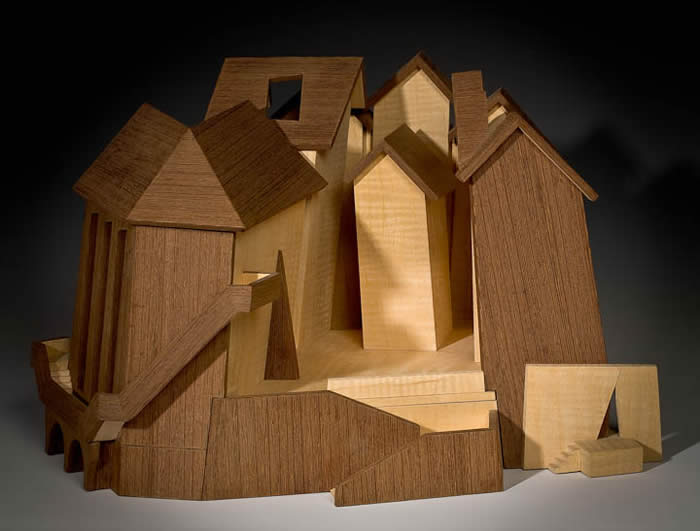 This miniature village/stage set is inspired by the 1919 German expressionist horror film, "The Cabinet of Dr. Caligari". It is my fantasy recreation of Holstenwall, the little hill town where the story takes place, and my attempt to capture in an abstracted way the eerie feel of the sets of this rather disturbing film. (CLICK HERE to see the video of the box.)